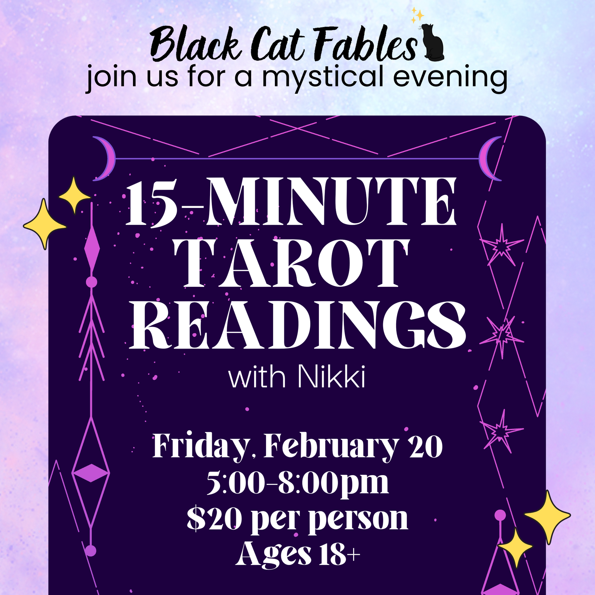Join us and local tarot reader and medium Nikki for an evening of 15-minute tarot readings! There are 12 time slots available on Friday, February 20th from 5:00-8:00 pm. Sessions are for adults age 18 and up and are $20.00 each.