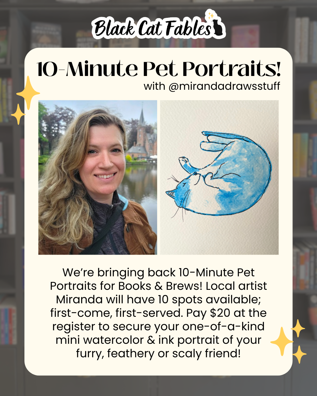 Miranda of Miranda Draws Stuff will also be here to do 10-minute pet portraits! Miranda only has 10 spaces available and portraits are first-come, first-served.