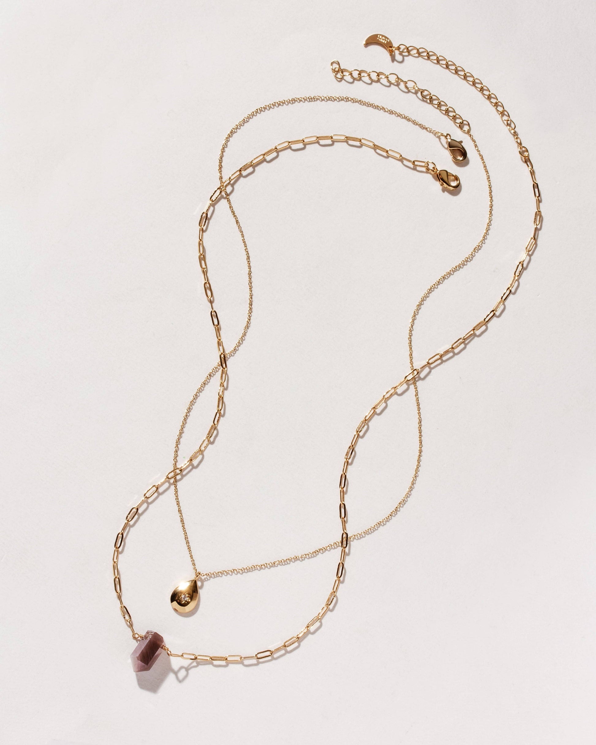 An elevated take on our best-selling necklace set, the All-Day Drip Necklace Set is destined to be a customer favorite. Featuring a faceted Coffee Moonstone pendant on a modern paperclip chain, we’ve paired it with a delicate chain showcasing a golden teardrop charm, accented with a CZ stone for a subtle sparkle.