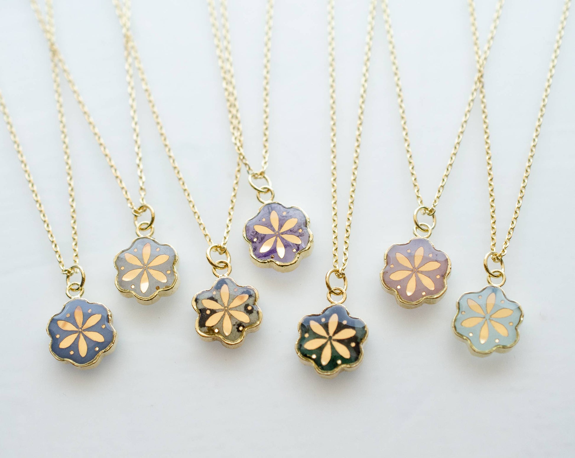 -Each pendant is a natural stone, with a gold plated over sterling silver border. Exact striations, coloration, and size may vary. The size of each pendant is approximately 14-16mm.