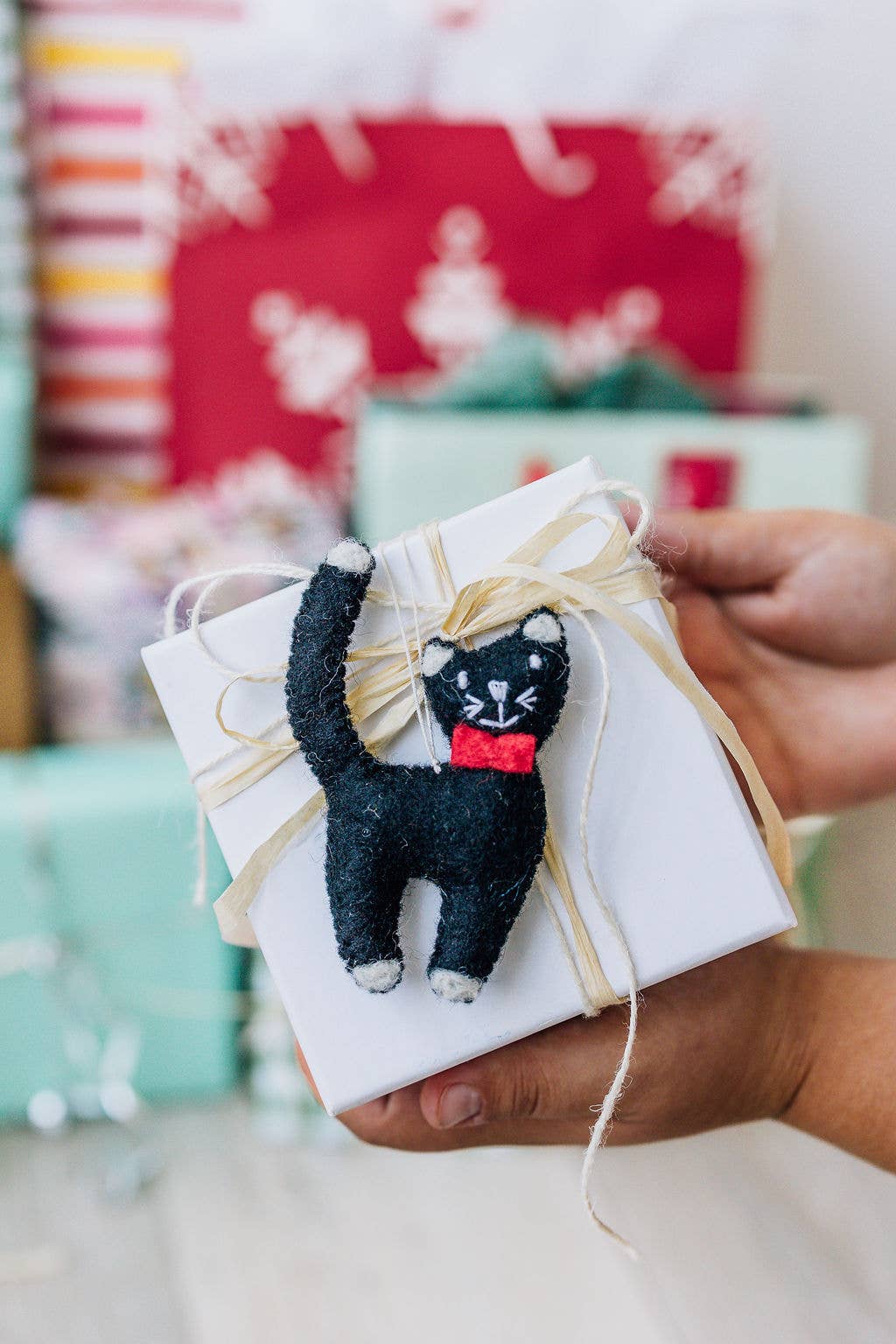 Introducing Nivas' Cat Ornament, an eco-friendly addition to your home decor. This ornament is not just an ordinary one, it's 100% handmade with wool felt, reflecting our commitment to craftsmanship and sustainability. As a part of our fair trade production, it aligns with our ethos of promoting ethical practices. Adding to its appeal, this piece is completely plastic-free, mirroring our dedication to the environment. Bring home this unique ornament and embrace a greener lifestyle.