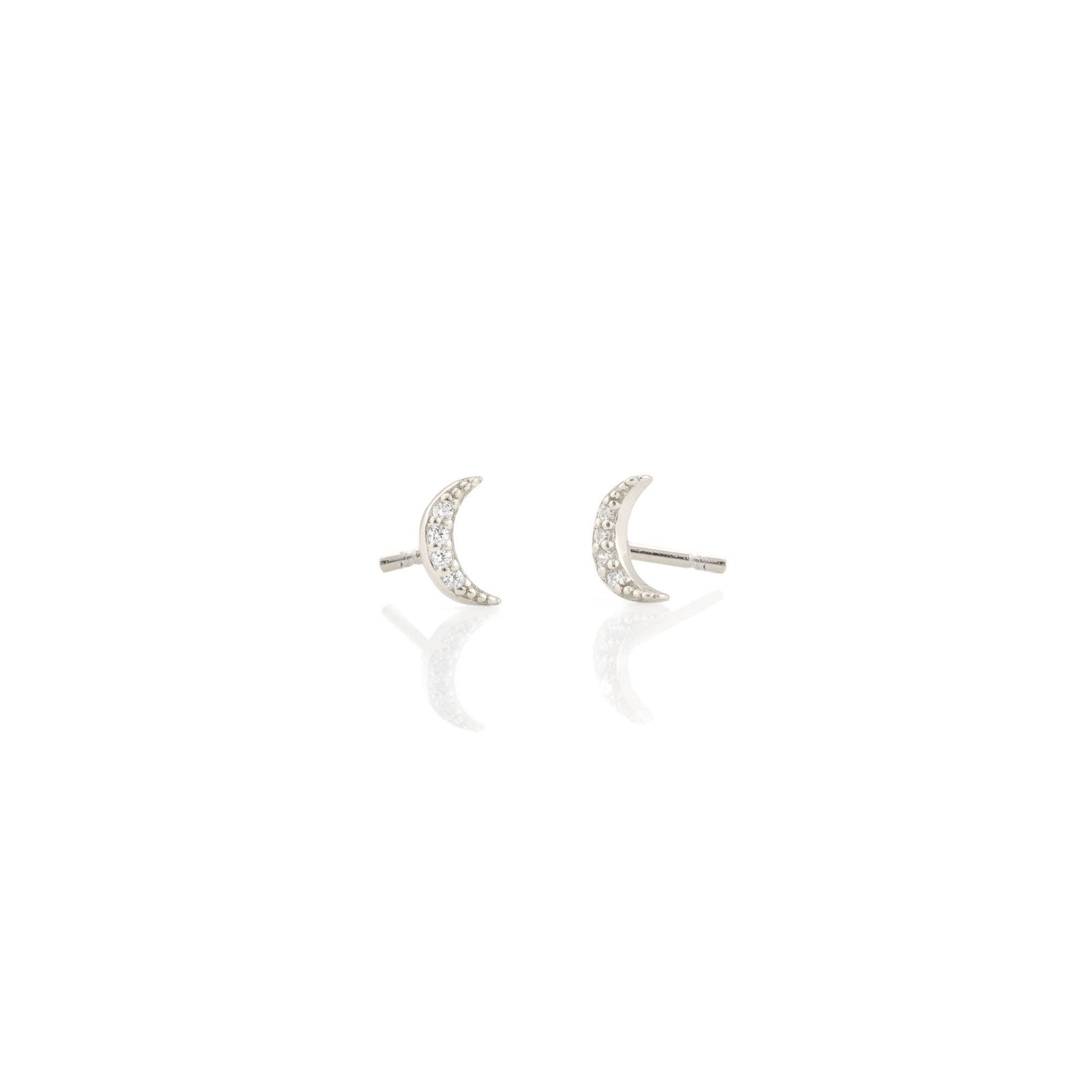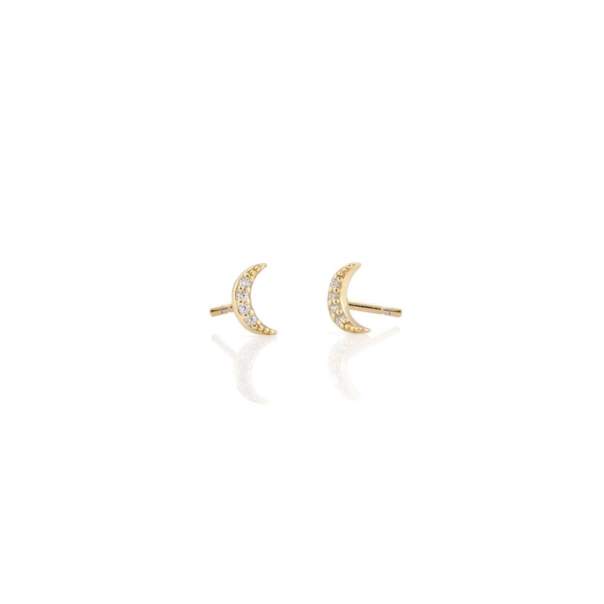 The crescent moon is a symbol for intuition and inspiration. These dainty beauties measure 0.25 inches. Available in 18K gold vermeil (sterling silver plated in 18K gold). Pave setting with cubic zirconia crystals. Packaged in our signature bottle.