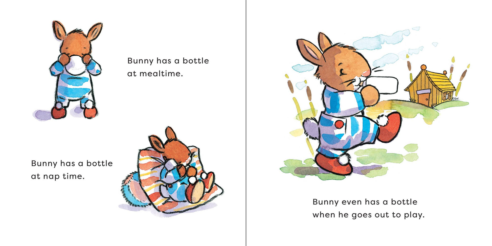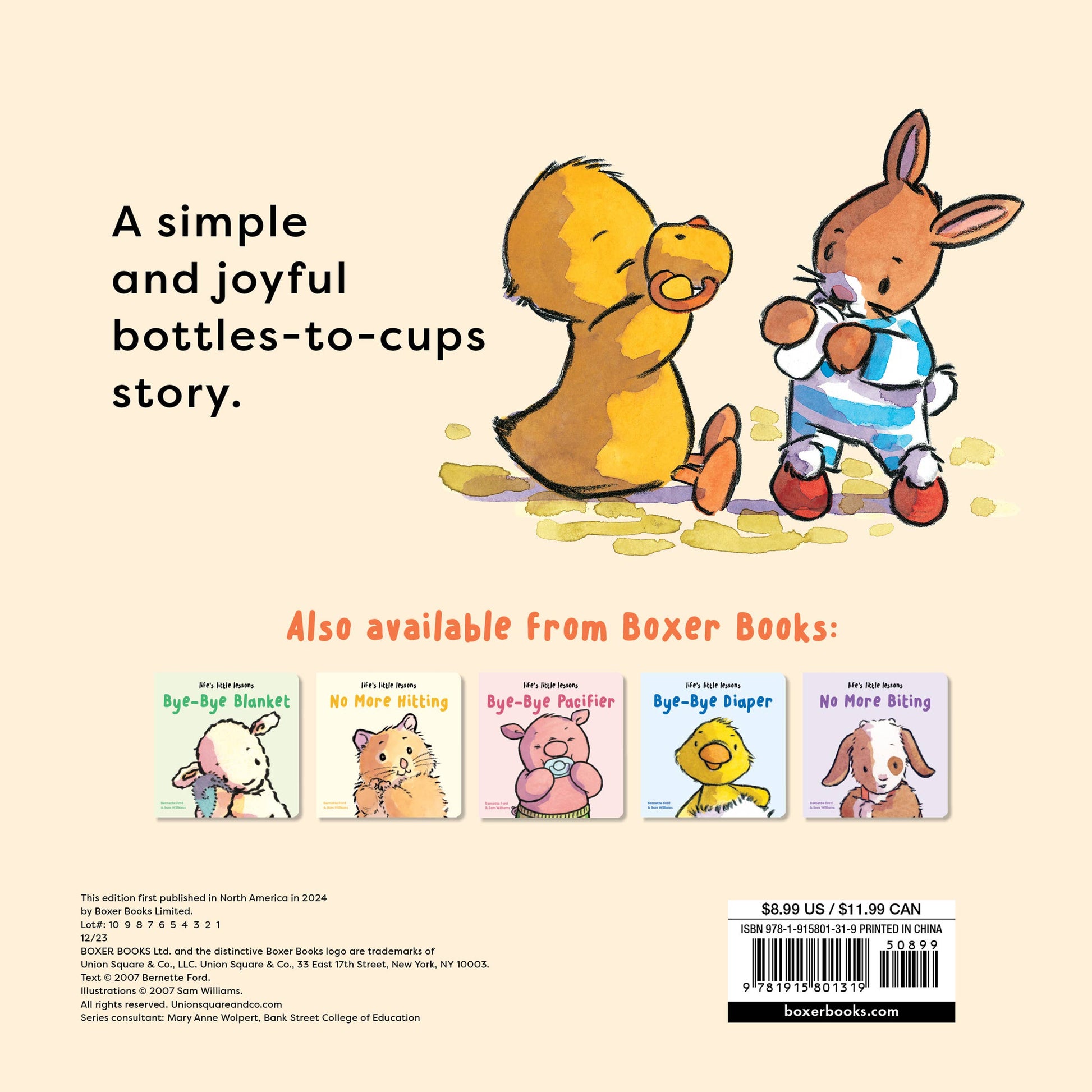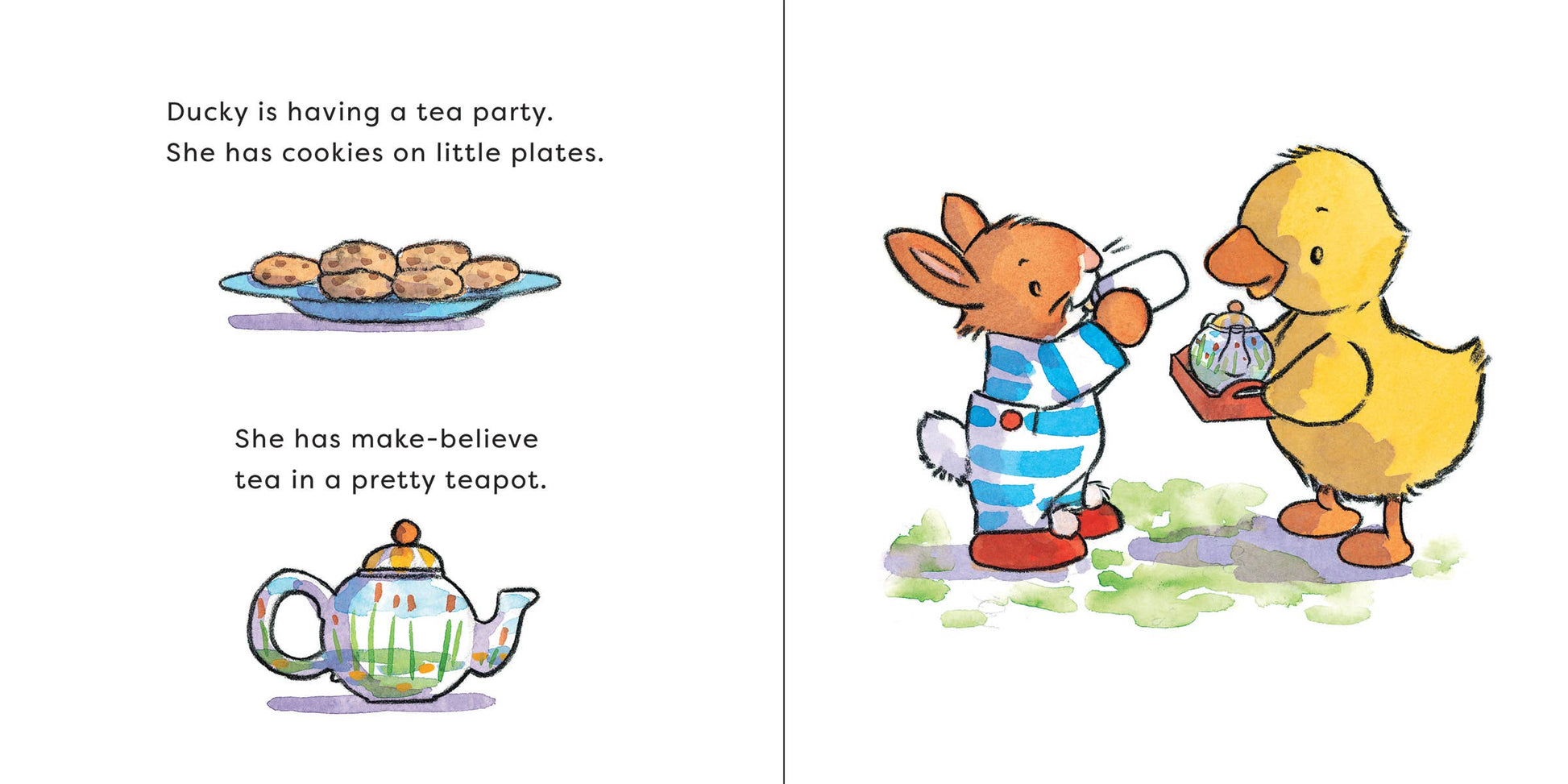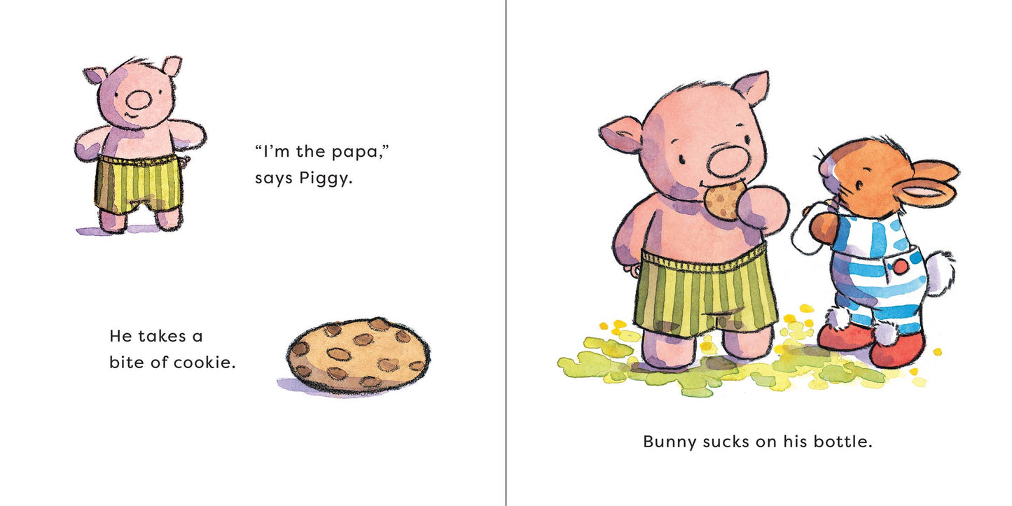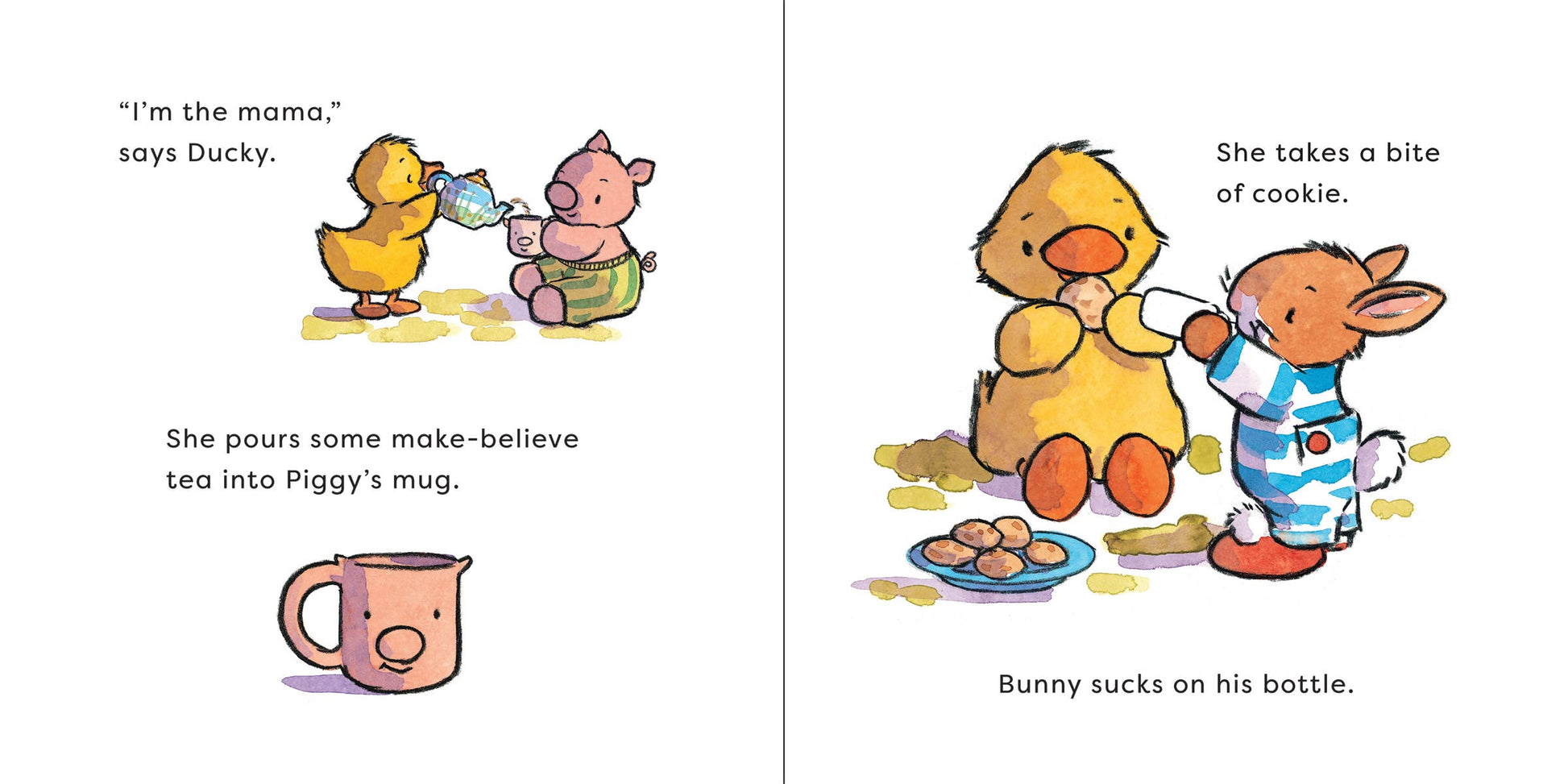 Piggy and Ducky have a new friend: Bunny, who drinks from his bottle at mealtime, naptime, and playtime. But now Bunny has an invitation to Piggy's lovely tea party . . . and no one drinks tea from a bottle! Will Bunny grow up and start using a cup? Children's Board Book; 8 x 8 inches; 26 pages.
