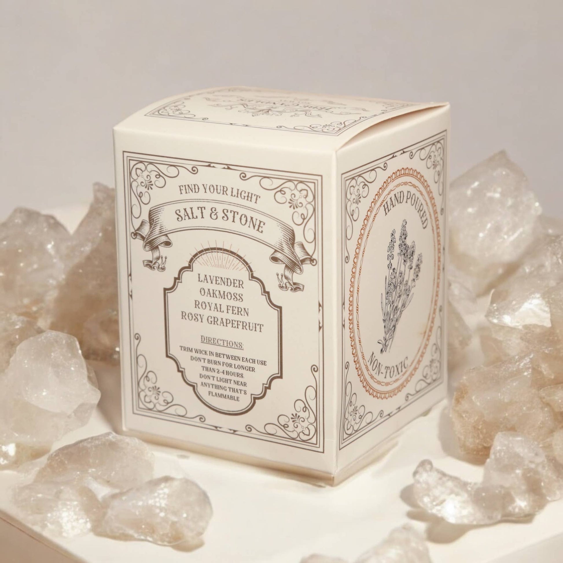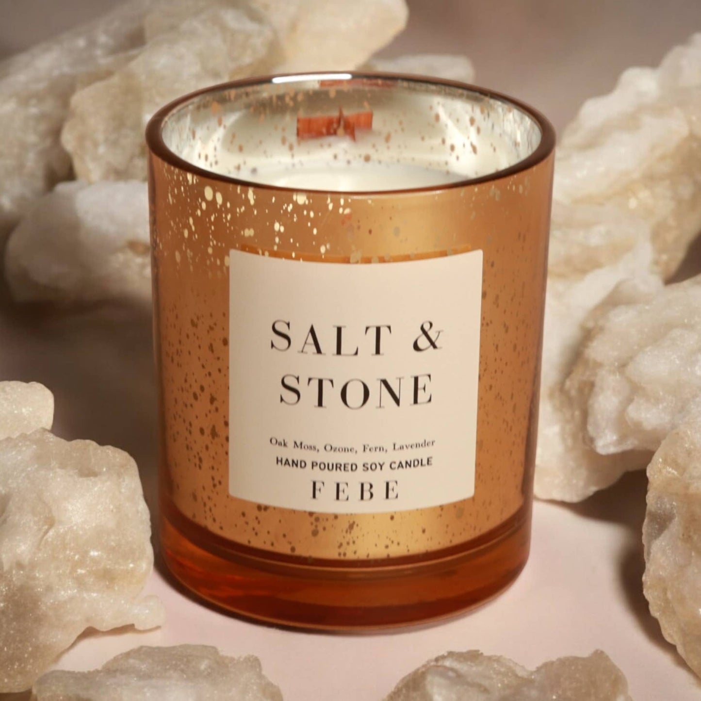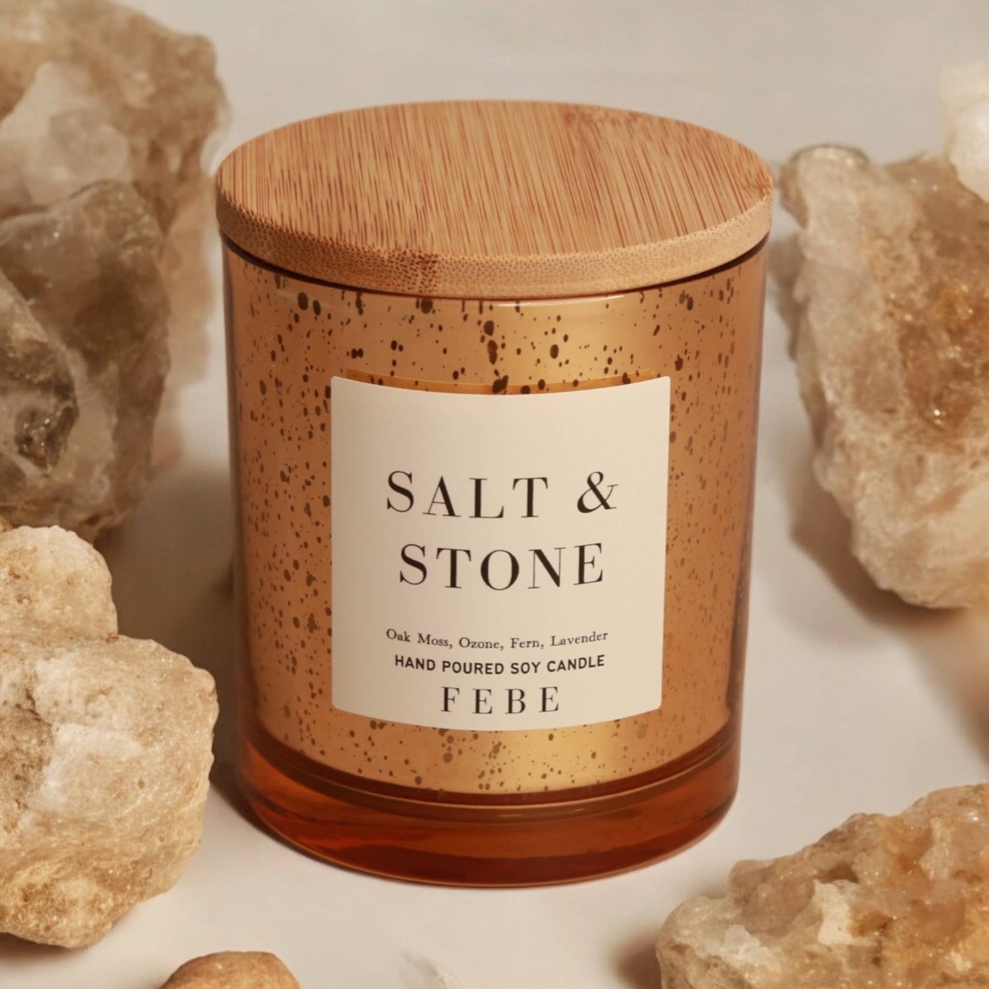 Unwind and rejuvenate with our elegant Salt & Stone candle. A captivating fragrance designed to soothe the senses. Experience the uplifting aroma of citrus, perfectly complemented by the earthy notes of sage. Delicate hints of lavender add a floral elegance, while the comforting base of salt, stone, and amber creates a tranquil atmosphere, inviting you to relax and indulge in moments of pure bliss.