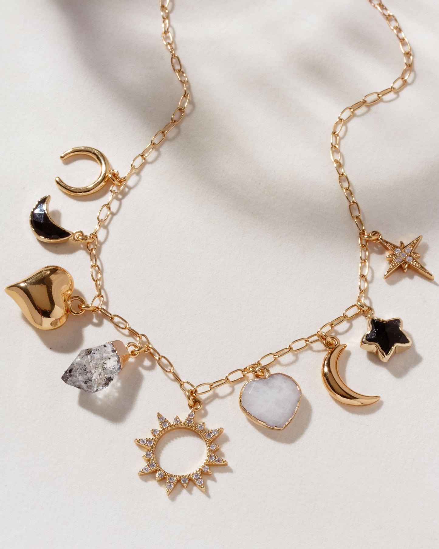 Designed for those seeking something truly unique, it showcases an artful mix of beloved charms, including a puff heart, CZ sun, polished moon, and Polaris star. A neutral palette ensures effortless styling, making it a versatile standout from day to night. While perfect for layering, its bold, radiant design shines solo—no stacking required.