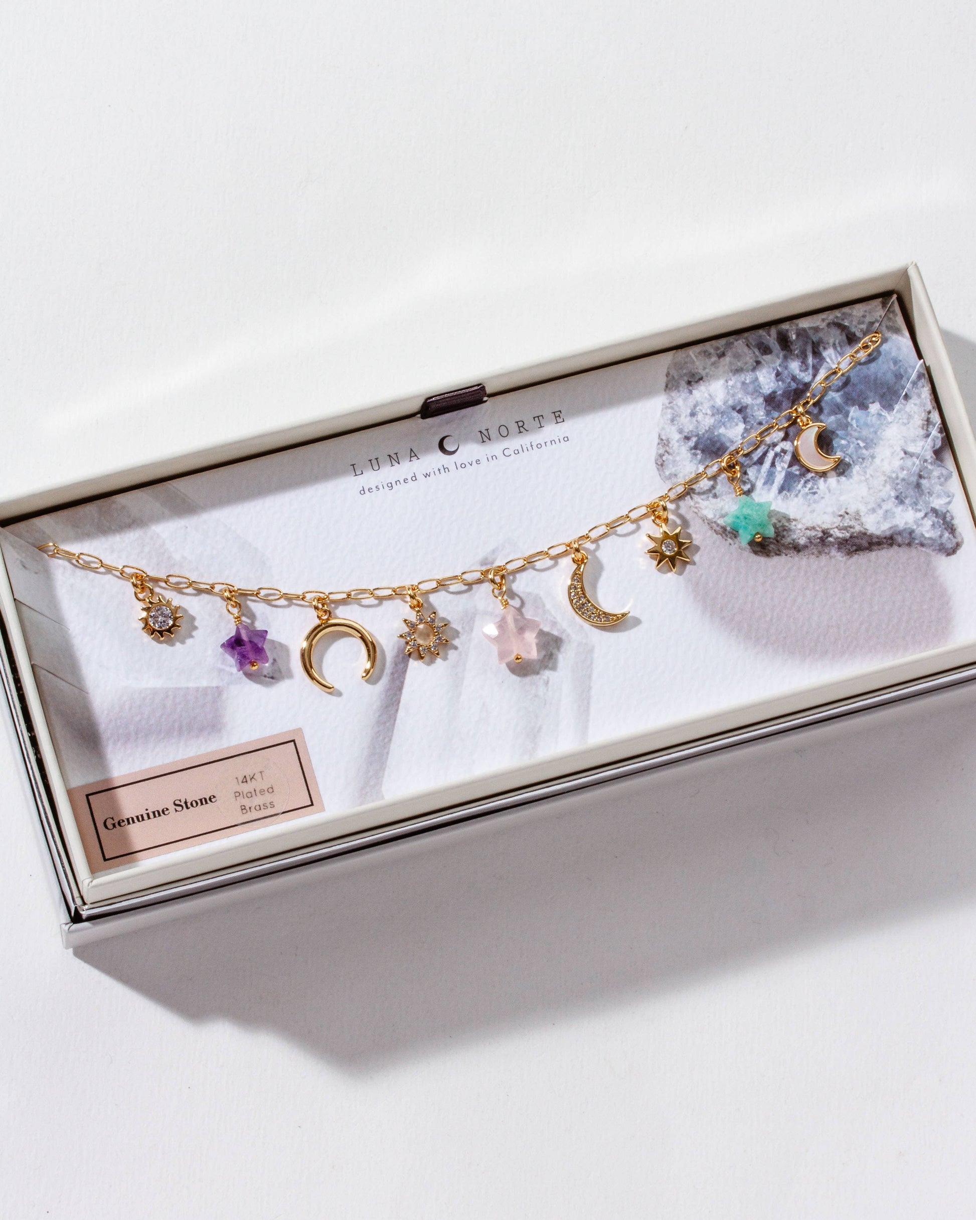 This charming necklace is a piece your customers are sure to adore. It features star-shaped beads crafted from genuine amethyst, amazonite, and rose quartz, paired with an array of celestial-inspired charms.