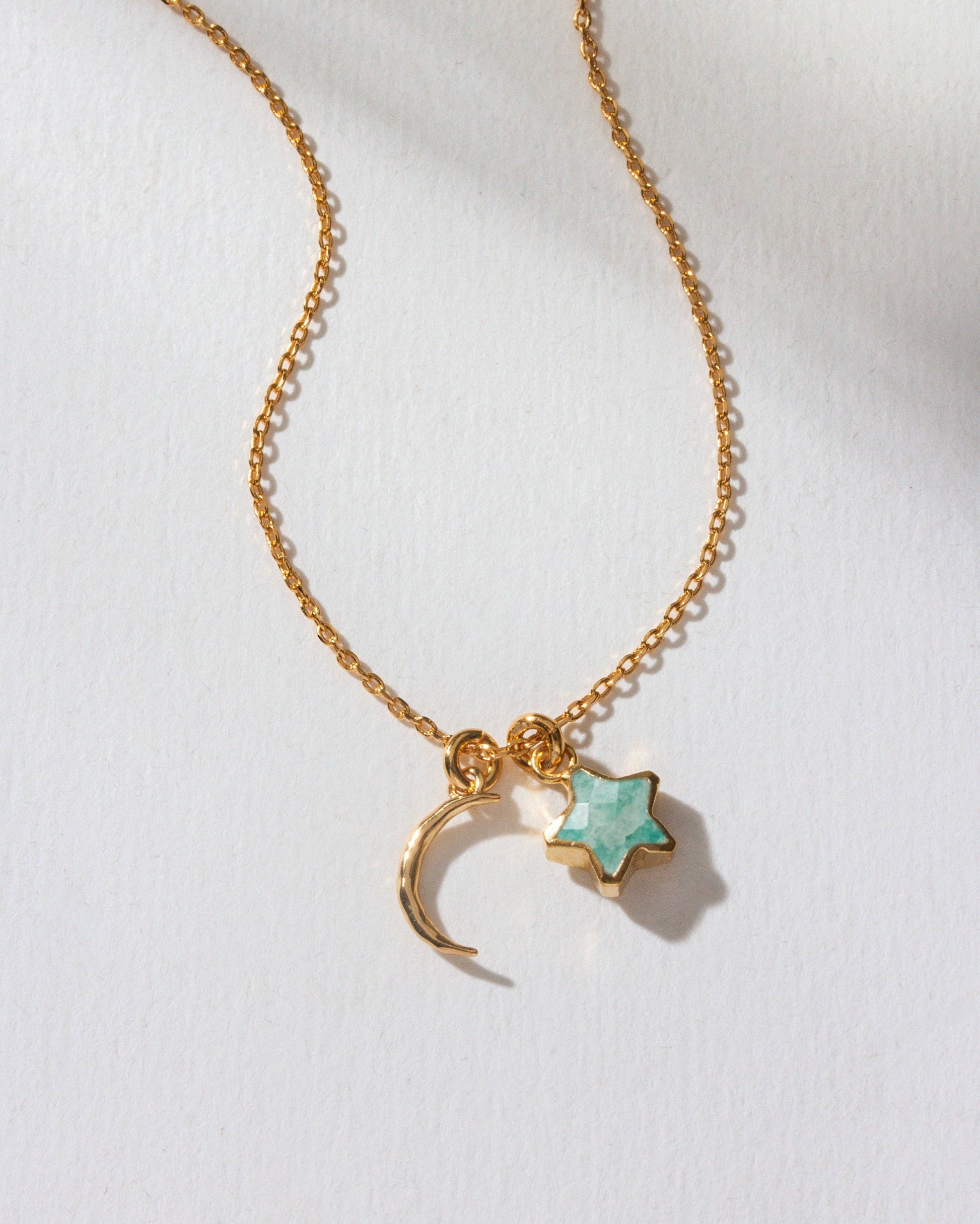 Celestial elements come together as we've paired our signature crescent charm with a sweet, amazonite charm. This darling necklace is an excellent choice for beginners building their jewelry collection and seasoned enthusiasts seeking a unique addition.