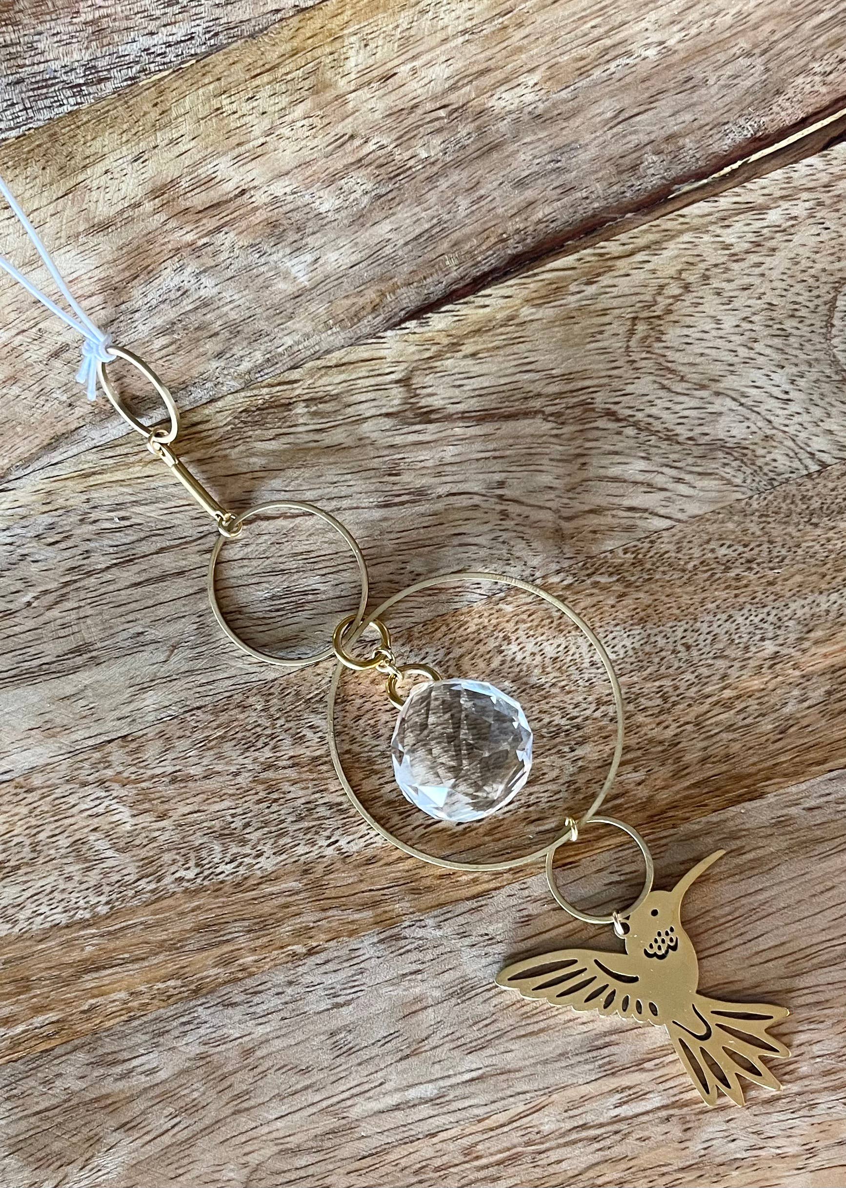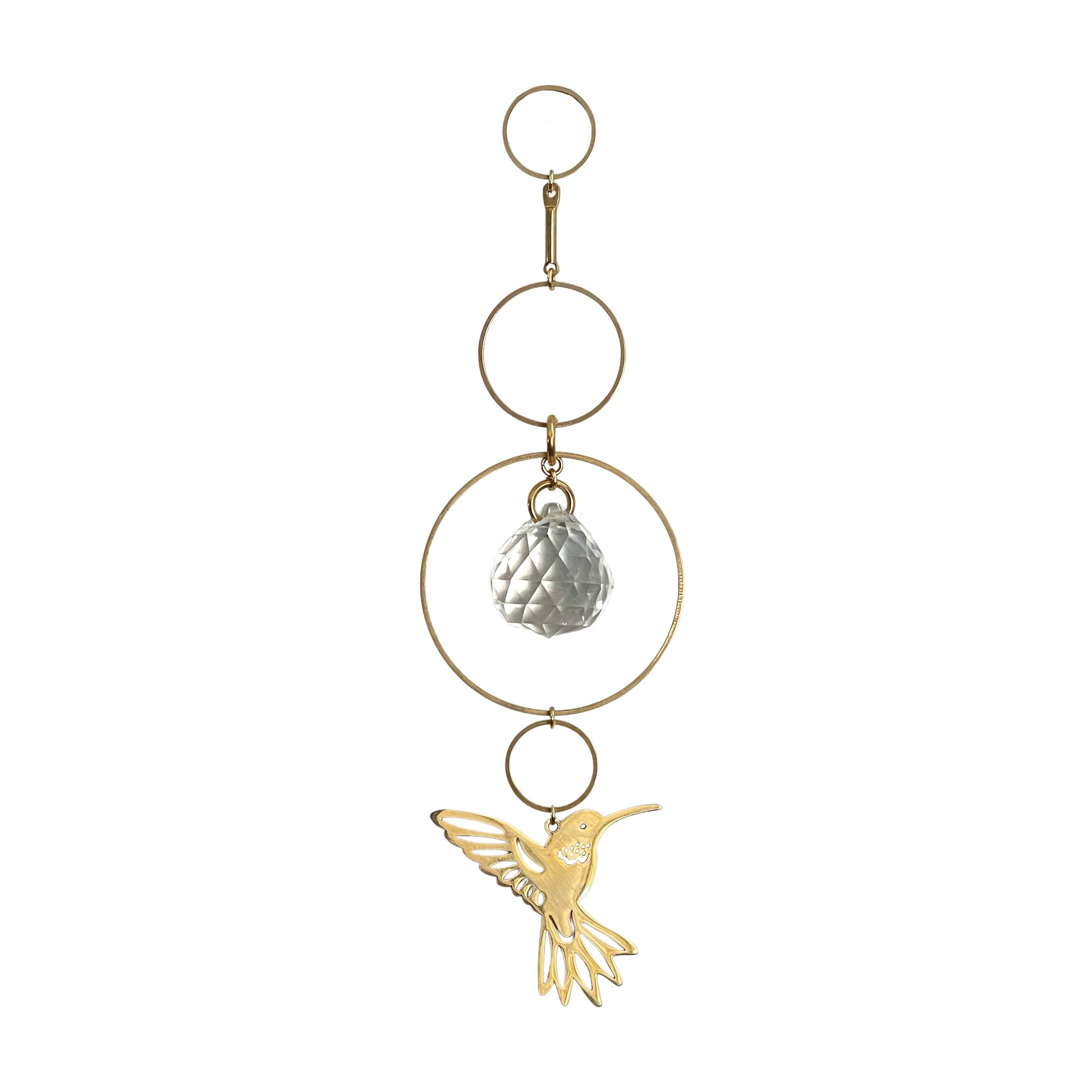 Give your room some extra sparkle with jewelry for your windows or walls. This one is for the hummingbird lovers! Our mini sun-catcher is a great size for a bedroom or dorm room window, or even as a rearview mirror decoration. Made from raw (lacquered) brass rings and gold plated stainless steel charms, and features a single super-faceted glass ball to reflect light all over the place. (P.S. Cats love it...)