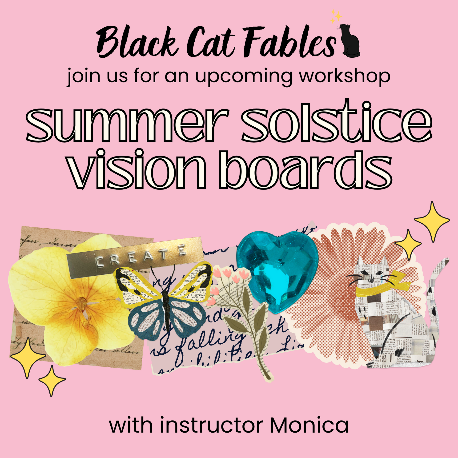 Join us at Black Cat Fables for a fun and relaxing workshop where you’ll create a vision board to mark the turning of the season! Monica Wilson, a retired teacher and passionate vision board enthusiast, will lead an inspiring and creative workshop designed to help you map out your dreams and goals at the Summer Solstice. Monica has guided vision board workshops for participants of all ages, from 9 to 90, and loves empowering others to bring their visions to life. Supplies are provided, but feel free to bring any personal touches you'd like to include.